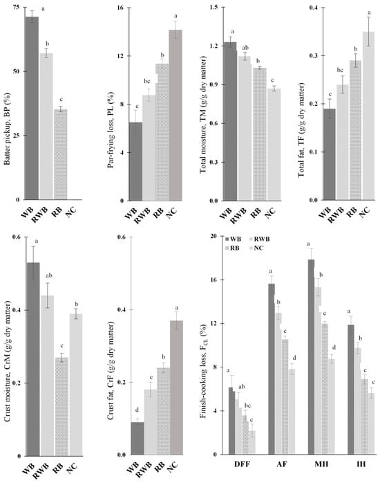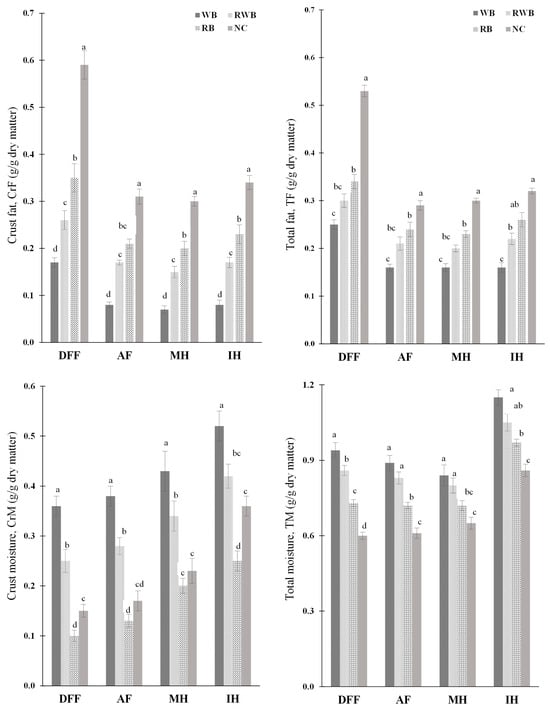 Moisture–fat profile of finish-cooked products. NC, RB, RWB and WB represent noncoated, rice flour-based-batter-coated, wheat and rice flour-based-batter-coated, and wheat flour-based-batter-coated meat analog, respectively. DFF, AF, MH and IH represent deep-fat frying, air frying, microwave heating and infrared heating, respectively. Lower-case letters (a–d) indicate significant (p < 0.05) differences in values for a given event.