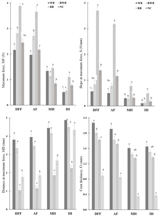 Textural and structural profile of finish-cooked samples. NC, RB, RWB and WB represent noncoated, rice flour-based-batter-coated, wheat and rice flour-based-batter-coated, and wheat flour-based-batter-coated meat analog, respectively. DFF, AF, MH and IH represent deep-fat frying, air frying, microwave heating and infrared heating, respectively. Lower-case letters (a–d) indicate significant (p < 0.05) differences in values for a given event.