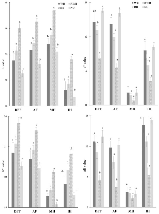 Color indices of finish-cooked samples. NC, RB, RWB and WB represent noncoated, rice flour-based-batter-coated, wheat and rice flour-based-batter-coated and wheat flour-based-batter-coated meat analog, respectively. DFF, AF, MH and IH represent deep-fat frying, air frying, microwave heating and infrared heating, respectively. Lower-case letters (a–c) indicate significant (p < 0.05) differences in values for a given event.