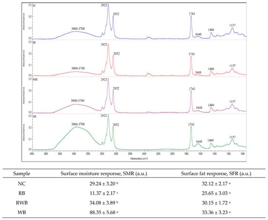 ATR-FTIR spectra of parfried samples and estimated mean values of absorbance unit. Downwards spectra: NC, RB, RWB and WB represent noncoated, rice flour-based-batter-coated, wheat and rice flour-based-batter-coated and wheat flour-based-batter-coated meat analog, respectively. Lower case letters (a–c) represent significant (p < 0.05) differences among means (within column).
