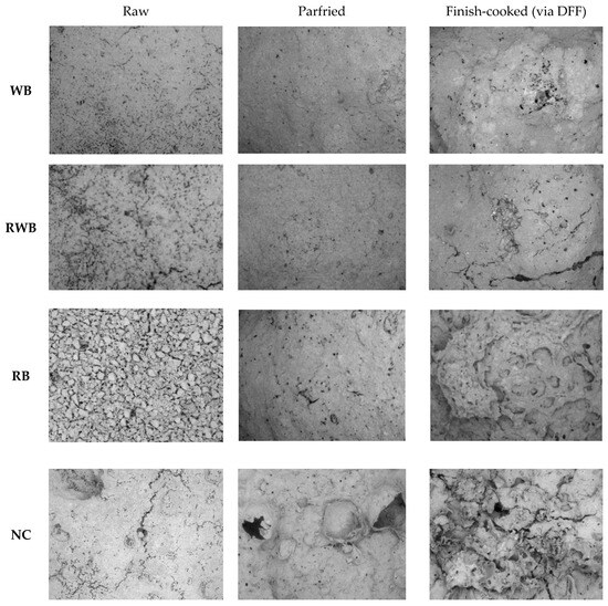 Processed micrograph of the meat analog-based samples’ surfaces. NC, RB, RWB and WB represent noncoated, rice flour-based-batter-coated, wheat and rice flour-based-batter-coated and wheat flour-based-batter-coated meat analog, respectively. DFF: deep-fat frying.