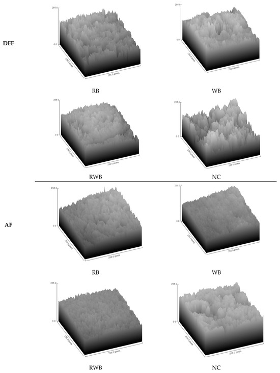 Surface roughness of the food matrix is a crucial parameter relating to its consumer acceptance. Figure 7 represents the surface roughness of meat analog-based finish-cooked products. Table 3 summarizes the effects of batter formulations and finish-cooking methods on surface roughness, as evaluated using the estimated fractal dimension (FD) value. Higher surface roughness was observed for RB-batter-coated meat analog samples in comparison to WB-batter-coated samples, and the relatively higher surface roughness reflected a higher fractal dimension (FD) value of RB coated samples. Batter formulation-associated differences in fried matrixes’ surface microstructure have been reported in the relevant literature [26]. Overall, the surface roughness of parfried samples increased (indicated by higher FD) due to finish-cooking, and deep-fat frying (DFF) caused higher surface roughness in comparison to air frying (AF).