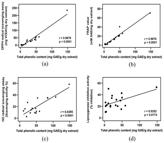 Correlation analysis between total phenolic contents of banana byproducts and their antioxidant and anti-inflammatory activities. Total phenolic content versus (a) DPPH radical scavenging activity, (b) FRAP value, (c) NO radical scavenging activity, and (d) 15-LOX inhibition activity. r: Pearson’s correlation coefficient.