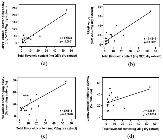 Correlation analysis between total flavonoid contents of banana byproducts and their antioxidant and anti-inflammatory activities. Total flavonoid content versus (a) DPPH radical scavenging activity, (b) FRAP value, (c) NO radical scavenging activity, and (d) 15-LOX inhibition activity. r: Pearson’s correlation coefficient.