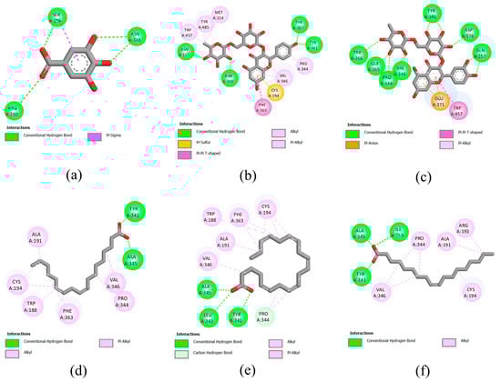 Molecular docking analysis of inducible iNOS (PDB ID: 3E6T). 2D diagrams of interaction between 3E6T and (a) gallic acid (positive control), (b) kaempferol-3-O-rutinoside, (c) rutin, (d) linoleic acid, (e) eicosapentaenoic acid, and (f) oleic acid.