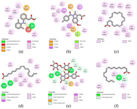 Molecular docking analysis of 15-LOX. 2D diagrams of interaction between 15-LOX and (a) sodium diclofenac (positive control), (b) indomethacin (positive control), (c) eicosapentaenoic acid, (d) linoleic acid, (e) rutin, (f) and linolenic acid positive control and compounds with the lowest binding energy.