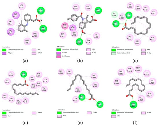 Molecular docking analysis of COX-2 (PDB ID: 5KIR). 2D diagrams of interaction between 5KIR and (a) sodium diclofenac (positive control), (b) indomethacin (positive control), (c) eicosapentaenoic acid, (d) oleic acid, (e) stearic acid, and (f) linolenic acid.