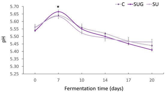 Evolution of the pH level in the fish sauces during the fermentation process. (C: control; SUG: sea urchin gonads; SU: whole sea urchin). Asterisks indicate the significant difference between the control samples (C) and the samples with sea urchin addition (SUG or SU) at each of the sampling time points (p < 0.05).