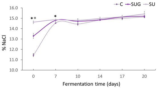 Evolution of the salt content levels (%) in the fish sauces during the fermentation process. (C: control; SUG: sea urchin gonads; SU: whole sea urchin). Asterisks indicate the significant difference between the control samples (C) and the samples with sea urchin addition (SUG or SU) and the symbol ° indicate the significant differences between the sea urchin samples SUG vs. SU at each of the sampling time points (p < 0.05).