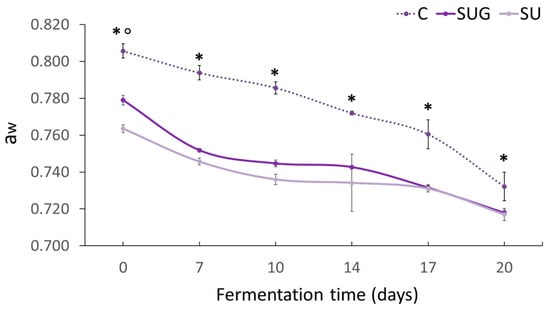 Evolution of aw in the fish sauces during the fermentation process. (C: control; SUG: sea urchin gonads; SU: whole sea urchin). Asterisks indicate the significant difference between the control samples (C) and the samples with sea urchin addition (SUG or SU) and the symbol ° indicates the significant differences between the sea urchin samples SUG vs. SU at each of the sampling time points (p < 0.05).