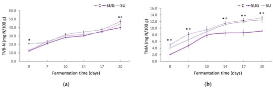 Evolution of the TVB-N (a) and TMA (b) contents in the fish sauces during their fermentation process. (C: control; SUG: sea urchin gonads; SU: whole sea urchin). Asterisks indicate the significant difference between the control samples (C) and the samples with sea urchin addition (SUG or SU) and the symbol ° indicates the significant differences between the sea urchin samples SUG vs. SU at each of the sampling time points (p < 0.05).