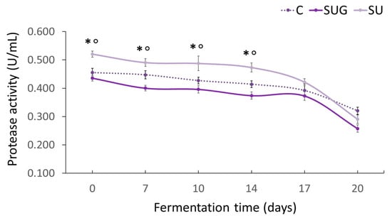 Evolution of the protease activity of the fish sauces during the fermentation process. (C: control; SUG: sea urchin gonads; SU: whole sea urchin). Asterisks indicate the significant difference between the control samples (C) and the samples with sea urchin addition (SUG or SU) and the symbol ° indicates the significant differences between the sea urchin samples SUG vs. SU at each of the sampling time points (p < 0.05).