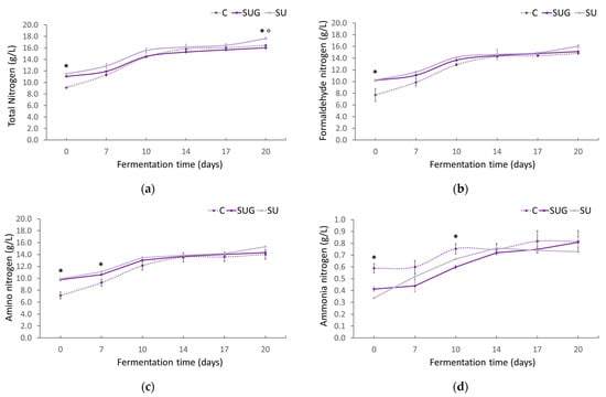 Evolution of the total nitrogen (a), formaldehyde nitrogen (b), amino nitrogen (c), and ammonia nitrogen (d) contents in the fish sauces during the fermentation process expressed as g/L (C: control; SUG: sea urchin gonads; SU: whole sea urchin). Asterisks indicate the significant difference between the control samples (C) and the samples with sea urchin addition (SUG or SU) and the symbol ° indicates the significant differences between the sea urchin samples SUG vs. SU at each of the sampling time points (p < 0.05).