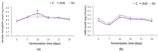 Evolution of the total viable count (log CFU/mL) of aerobic mesophilic (a) and LAB (b) in the fish sauces during their fermentation process. (C: control; SUG: sea urchin gonads; SU: whole sea urchin). Asterisks indicate the significant difference between the control samples (C) and the samples with sea urchin addition (SUG or SU) at each of the sampling time points (p < 0.05).