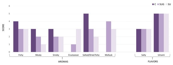 Figure 8 shows the eight outstanding organoleptic characteristics of the fish sauce samples produced in this study based on their respective Quantitative Descriptive Analysis (QDA), where a panel composed of ten individuals has evaluated a total of ten attributes. According to this evaluation, it can be seen that their aromatic attributes, rather than their taste attributes, were more clearly affected by the addition of sea urchin to the formulation. Thus, all three types of sauces presented a similar intensity of umami and salty flavors, with no crustacean flavors standing out over the fish. Nonetheless, the usage of sea urchin resulted in an increment in the mollusk and crustacean aroma scores and lower meaty, fishy, smoky, and salted/dried fishy aroma scores. With regard to the tasters’ preferences, the sauces that contained sea urchin stood out for their particular aroma of mollusks and crustacea, but no order of preference between sea urchin sauces with or without shell could be established.