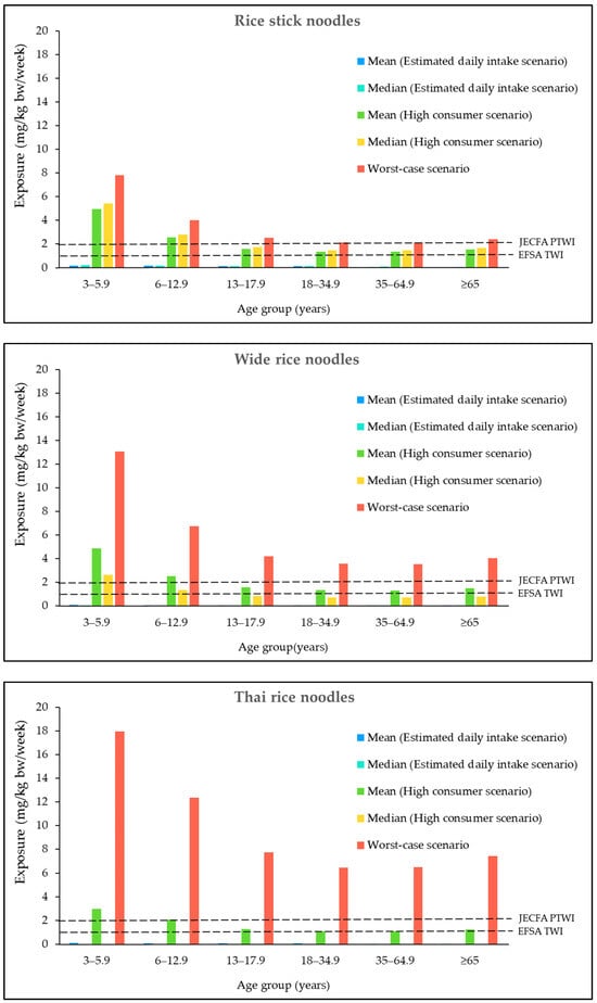 Figure 1 presents the Al exposure from the consumption of noodle products in each individual age group. Among all age groups, the highest Al exposure from the consumption of each type of noodle, in all exposure scenarios, was found in children aged 3–5.9 years. In both the estimated daily intake and high consumer scenarios, children aged 3–5.9 years had the highest exposure to Al from the consumption of rice stick noodles. However, in the worst-case scenarios, the highest Al exposure was found from the consumption of Thai rice noodles.