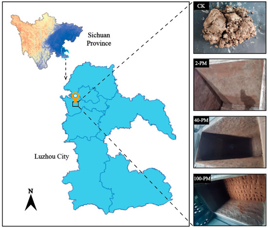 Location map of sampling sites in Luzhou, Sichuan. CK, yellow soil; 2-PM, 2-year pit mud; 40-PM, 40-year pit mud; 100-PM, 100-year pit mud.