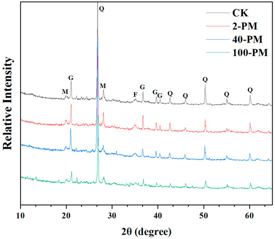 The mineral composition varies in different samples. CK, yellow soil; 2-PM, 2-year pit mud; 40-PM, 40-year pit mud; 100-PM, 100-year pit mud; Q, quartz; G, goethite; M, mahlmoodite; F, ferrorichterite.