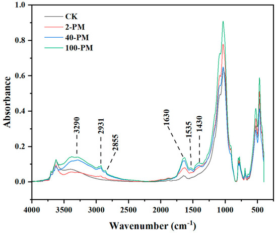 ATR-FTIR spectra of different samples. CK, yellow soil; 2-PM, 2-year pit mud; 40-PM, 40-year pit mud; 100-PM, 100-year pit mud.