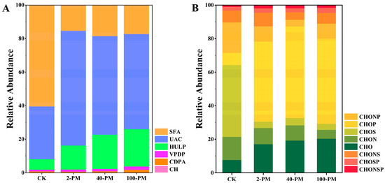 Type of DOM compounds (A) and element composition (B). SFA, saturated fatty acid; UAC, unsaturated aliphatic compounds; HULP, highly unsaturated lignin/phenolics; VPDP, vascular plant-derived polyphenols; CDPA, combustion-derived polycyclic aromatics; CH, carbohydrates. CHO, any formulae without heteroatoms; CHON, any formulae with N only; CHOS, any formulae with S only; CHOP, any formulae with P only; CHONS, any formulae with N and S; CHONP, any formulae with N and P; CHOSP, any formulae with S and P; CHONSP, any formulae with N, S, and P. CK, yellow soil; 2-PM, 2-year pit mud; 40-PM, 40-year pit mud; 100-PM, 100-year pit mud.