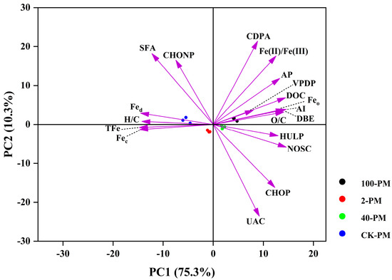 PCA was used to evaluate the correlation between iron (hydr)oxides and DOM compounds (Figure 5). The different samples were clearly separated in the PC1 and PC2 axes. The PC1 and PC2 axes explained 75.3% and 10.3% of the total variance, respectively.