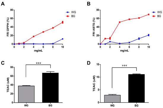 24] with slight modifications. BG and WG extracts were resuspended in methanol solvent and a sample of each extract (20 µL) was added to 0.6 mM DPPH dissolved in MeOH solution (180 µL). After incubating the solution at room temperature in the dark for 30 min, the absorbance was measured at 515 nm, and the radical scavenging activity was expressed as a percent inhibition: DPPH inhibition (%) = ([AC − AS]/AC) × 100, where AC was the absorbance of the control (blank), and AS was the absorbance of the extract. Trolox (6-hydroxy-2,5,7,8-tetramethylchroman-2-carboxylic acid) was used as a standard to construct the calibration curve. Stock standard solutions were prepared in MeOH. Working solutions were prepared via dilution and, to avoid degradation, were stored at 4 °C in the dark. The calibration line was constructed with linear regression using five concentrations. The determination coefficient was 0.995 for the linear range of 0.2–3 mM. Measurements were performed in triplicate. Absorbance values were corrected for radical decay using blank solutions.