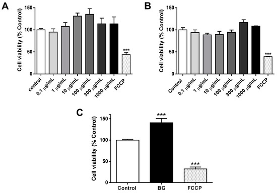 Figure 2A,B). However, these experiments also showed that the garlic extracts did not promote further viability of the cells. Nevertheless, when we tested the effect of BG on mouse brain slices, a more intact neural preparation that includes neurons and glial cells organized in a tridimensional structure, we observed an increase of ≈40% in the cell viability (