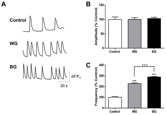 Results are expressed as mean ± SEM. Statistical analysis was performed using one-way ANOVA and unpaired t-tests. The results * p < 0.05, ** p < 0.01 and *** p < 0.001 versus control, and + p < 0.05, ++ p < 0.01 and +++ p < 0.001 WG versus BG were considered statistically significant. All the analyses were performed with GraphPad Prism software (GraphPad Prism, CA, USA).