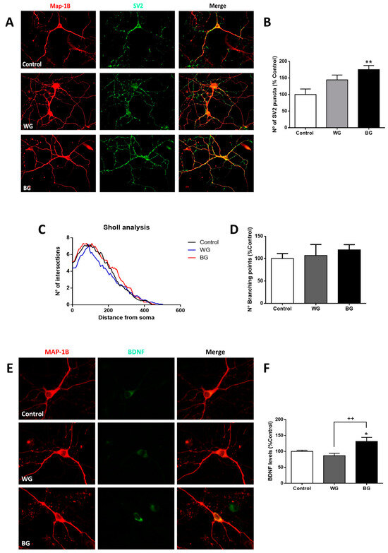 Figure 4E,F), suggesting an upregulation of BDNF expression triggered by BG chemical compounds. This finding supports the idea that BG improves neuronal survival and synaptic connectivity through increased BDNF signaling. Since the WG preparation was unable to modify the BDNF immunoreactivity in our experiments, it is possible to suggest that the chemical composition of BG extracts possesses key molecules that enhance BDNF expression. The higher content of DAS in BG suggests a pivotal role of this specific compound in the processes of synaptic plasticity. The potential beneficial role of DAS contrasts with observations from other research groups, which found that DADS, another garlic sulfur compound, decreased the BDNF levels in the hippocampus, promoting defects in memory and neurocognitive functions [