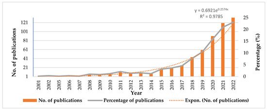 The publication statistics for the identified papers are presented in Figure 1. When analyzing the publication trends over time (from 2000 to 2022), we can approximate four distinct stages according to the model of Zhang et al., 2022 [17]. In stage one (2000–2014), with the exception of 2011, there were fewer than 10 papers published annually. This phase started from the first article published by Lee et al., 2001 [18], until 2014, and only a limited number of papers (61) were published, constituting only 10.65% of the total publications during this period. In stage two (2015–2018), there was a gradual increase in the number of papers published per year, ranging from fewer than 10 to almost 50 papers annually. Between 2015 and 2018, there was a notable increase in publications: from 18 papers (3.14%) in 2015 to 44 papers (7.68%) in 2018. In stage three (2019–2020), there was a sustained gradual increase, with an annual publication count ranging from over 50 papers to just under 100 papers. The number of publications varied between 60 papers (10.47% in 2019) to 91 papers (15.88% in 2020). In the last stage, between 2021 and 2022, the number of articles published each year exceeded 100 papers, ranging from 120 papers (20.94% in 2021) to 132 papers (23.04% in 2022). Notably, the publications related to the health risk assessment of heavy metals from food products increased significantly, from just 1 paper in 2001 to 132 papers in 2022. The top three years in terms of published papers were 2020 (91, 15.88%), 2021 (120, 20.94%), and 2022 (132, 23.04%). As can be seen from Figure 1, in 2000, no article was published. This trend analysis highlights the growing concern over the past two decades regarding the adverse health effects of heavy metal ingestion through contaminated food products.