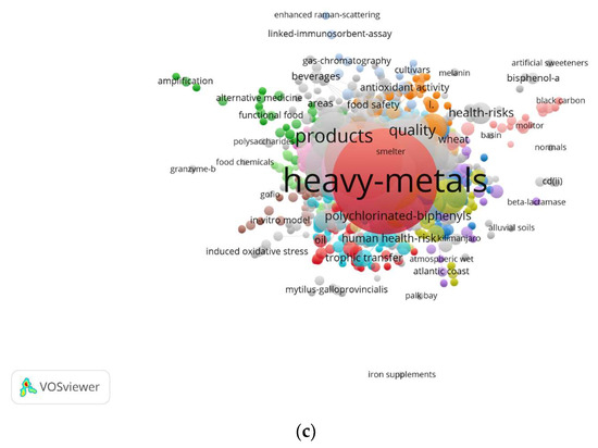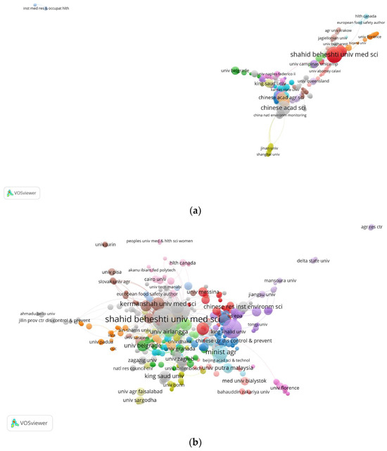 The co-authorship organizations were analyzed using VOSviewer software, resulting in the network visualization presented in Figure 2a. In this visualization, a total of 585 items were categorized into 32 clusters, representing nodes and links based on their strength. The thickness of the links depends on the number of articles published through co-authorship collaborations [64]. Notably, the Ministry of Agricultural Rural Affairs, Shahid Beheshti University of Medical Sciences, Chinese Academy of Sciences, and Egyptian Knowledge Bank (EKB) emerged as the top organizations in terms of articles published with co-authorship in the field of health risk assessment of heavy metals in food products. They were followed by Tehran University of Medical Sciences, Hormozgan University of Medical Sciences, Universidade Estadual de Campinas, Chinese Academy of Agricultural Sciences, and Kermanshah University of Medical Sciences, among many others. Among the total of 573 articles, 100 publications were authored by individuals who were affiliated with the same institution.