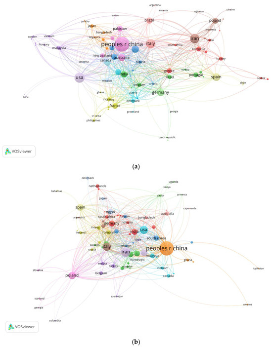 Figure 3b displays the citation network of countries. The VOSviewer software identified 14 clusters and 495 countries that cited the countries included in the study. The People’s Republic of China received the highest number of citations (4128 citations), followed by the USA with 1957 citations, Iran with 1647 citations, Italy with 1623 citations, Spain with 1145 citations, Germany with 990 citations, South Korea with 961 citations, and Australia with 956 citations. The remaining countries received fewer than 900 citations. Interestingly, South Korea and Australia, despite not being among the top 10 most prolific countries, are among the 8 most cited countries.