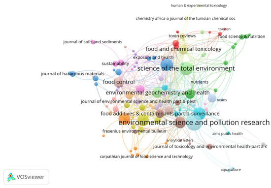 The citation network of countries is illustrated in Figure 4. The VOSviewer software identified 19 clusters and 407 journals that cited the journals included in the study. The Food and Chemical Toxicology Journal received the highest number of citations, with 997 citations, followed by Science of the Total Environment with 805 citations, Environmental Science and Pollution Research with 715 citations, Environment International with 610 citations, Ecotoxicology and Environmental Safety with 590 citations, and Food Additives and Contaminants, Part A: Chemistry, Analysis, Control, Exposure, and Risk Assessment, with 560 citations. The remaining journals received fewer than 500 citations. Interestingly, Environment International and Ecotoxicology and Environmental Safety, despite not being among the top 10 journals in terms of the number of papers published, are among the 6 most cited journals.