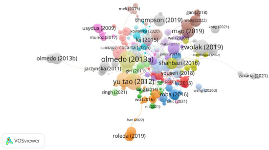 Network visualization of documents citation. (Cluster 1: Li (2015) [89]; Zhao (2021) [43], Cluster 2: Ni (2021) [90]; Cluster 3: Roba (2016) [91], Cluster 4: Atambayeva (2022) [92], Cluster 5: Jalali (2021) [93], Cluster 6: Kowalska (2020) [94], Cluster 7: Roleda (2019) [95]; Han (2022) [96]; Wu (2016) [97]; Cluster 8: Gan (2018) [98], Wang (2022) [99], Cluster 9: Usydus (2009) [100], Munoz (2015) [22], Cluster 11: Singh (2021) [101], Giri (2011) [102], Cluster 12: Yousefi (2018) [103], Wang (2020) [104], Cluster 13: Olmedo (2013) [73], Cluster 14: Wei (2020) [105], Cluster 15: Cocarta (2016) [106], Cluster 16: Yu Tao (2012) [75], Cluster 17: Meli (2015) [107]; Cluster 18: Kilic (2021) [108], Cluster 19: Shahbazi (2016) [109], Cluster 20: Lei (2015) [110], Lucic (2022) [31], Cluster 21: Jarzynska (2011) [111], Cluster 22: Zwolak (2019) [2], Cluster 23: Zakaria (2021) [112], Cluster 24: Kong (2021) [113], Cluster 25: Tang (2014) [114], Cluster 26: Thompson (2019) [80], Cluster 27: Olmedo (2013) [86].