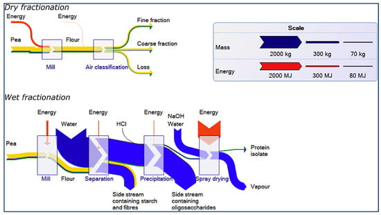 Energy consumption of dry and wet fractionation is shown as Sankey’s model. Adapted from Schutyser et al. [].