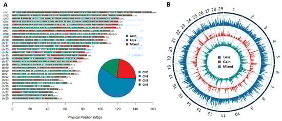 The CNVs were merged into CNV regions (CNVRs) using HandyCNV []. The “call_cnvr” option identified CNVRs through the union of CNV sets that overlapped by at least one base pair. CNVs of overlapping gain and were combined into a single region to account for genomic regions where both events had happened (“mixed” CNVR).