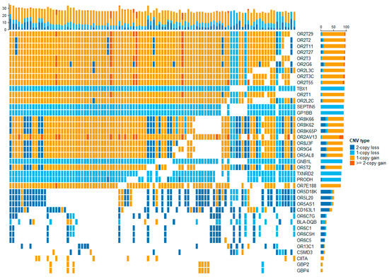 Stacked bar plots showing the genes with highest frequency overlapping with CNVRs; the top and right section of the plots show the number of altered genes per sample and the number of altered samples per gene, respectively.