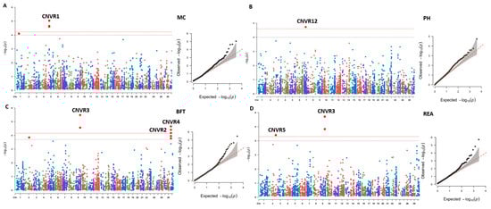 Manhattan and QQ plots showing the −log10 p-values for CNV-based GWAS. (A–D) Genome-wide association results of CNV segments for MC, pH, BFT and REA, respectively. The red and black lines represent the genome-wide significance threshold at p value = 4 × 10−05, 2 × 10−04.