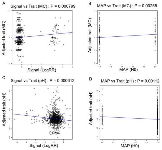 Region association tests of CNV segments at 27 Mb on BTA5 and 4 Mb on BTA7 for MC and pH. (A) The adjusted traits against signals (LogRR) for CNV segments at 27 Mb on BTA5. (B) The adjusted traits against copy number states (MAPs) estimated for CNV segments on BTA5 using mixture model assignment. (C) The adjusted traits against signals (LogRR) for CNV segments at 4 Mb on BTA7. (D) The adjusted traits against copy number states (MAP) estimated for CNV segments on BTA7 using mixture model assignment.