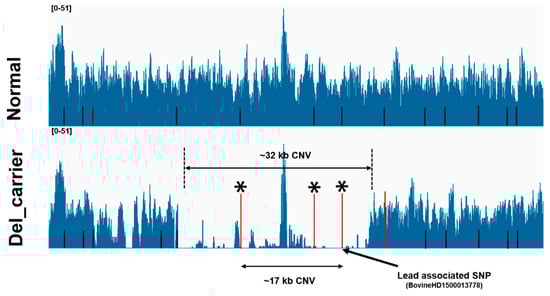 Identification of a 32 kb deletion (BTA 15:47,429,054-47,461,008) with WGS using IGV. The 17 kb deletion (BTA 15:47,438,725-47,455,722) was detected with CNV-based GWAS, and the main associated SNP was BovineHD1500013778. Four SNP probes (marked in red) mapped by CNV-GWAS were located within the CNVR12, while three probes (marked with black asterisks) were supported by read-depth signals.