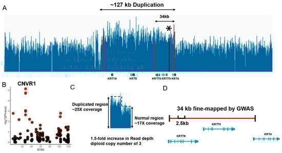 In the present study, we used WGS data from the same population of cattle based on read-depth signals to validate their CNVs, and compared them to the occurrence of CNVRs from WGS samples of multiple cattle populations. Strikingly, among these twelve CNVRs, four candidate CNV segments were found to be partially overlapped with the CNVRs of high confidence from other cattle populations. Eventually, we characterized CNVR1 and confirmed the presence of the ~12 kb CNV at 27.119 Mb on BTA5 in Bos taurus and Bos indicus based on read-depth signals which have undergone selection in a previous report []. The previous study suggests that among three KRT gene families overlapping with CNVR1 could have a role in the development of skin. For instance, mutations in the KRT4 gene have been proven to encode mucosa-specific keratins which may cause white sponge naevus in humans []. Meanwhile, variants overlapping with the KRT79 gene lead to the destabilization of K14 in sebocytes, attenuating sebocyte differentiation and lipid content in the skin []. In livestock, an overexpression of the KRT4 gene was found to bind Tβ4, mediating the ERK signaling pathway in cashmere goats, which might control the developmental patterning of hair follicles []. Previous studies also found that the expression levels of KRT4 and KRT78 were higher in telogen compared to catagen and anagen through analysis of the transcriptome data of yak hair follicles at different developmental stages []. Despite the fact that many previous findings have shown that these three genes encoding keratin filament may be related to hair generation, the functional activity of KRT genes and the CNV dosage effect of KRT for MC still need to be fully examined by multi-omic strategies and molecular experiments.