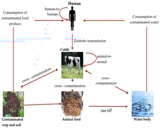 Transmission route of pathogenic E. coli among animal, human, and environment (source: this study—diagram prepared by authors).