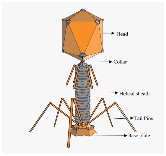 Diagrammatic representation of tailed phage (https://en.m.wikipedia.org/wiki/Bacteriophage, accessed on 1 September 2023).