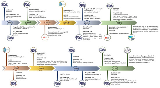 Phage-based products that have already received approval around the world. The manufacturer, the target microorganisms, and the food matrix where the product is intended to be applied are all listed in the product description. The FDA, FSANZ, and the companies’ news websites were used to create the timeline. Adapted with permission from: Pinto et al. [80], 2023, Taylor & Francis Ltd., http://www.tandfonline.com, 1 September 2023.