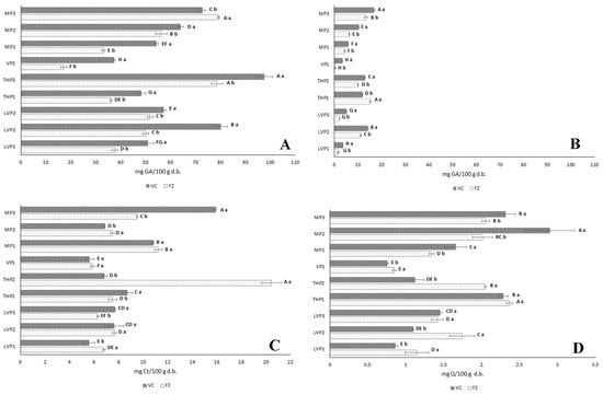 Total phenols (mg of GA/100 g dry basis (d.b.)) of honey powders (A) and their methanolic extracts (B), total flavanols (mg of Ct/100 g dry basis (d.b.)) (C) and total flavone/flavonols (mg of Q/100 g dry basis (d.b)) (D) obtained with vacuum (VC) and freeze (FZ) drying using maltodextrin (MD) (n = 3). Error bars represent the standard deviation for each data point. Different capital letters (A–H) indicate significant differences (p < 0.05) among different honeys. Different lowercase letters (a,b) indicate significant differences (p < 0.05) between drying procedure. Ct: catechin; Q: quercetin; LVP: lavender honey powder; THP: thyme honey powder; VP: vetch honey powder; MP: multifloral honey powder.