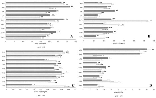 Anti-inflammatory activity of powdered honeys obtained with vacuum (VC) and freeze (FZ) drying, using maltodextrin (MD) (n = 3). Error bars represent the standard deviation for each data point. Different capital letters (A–F) indicate significant differences (p < 0.05) among the different botanical origins. Different lowercase letters (a,b) indicate significant differences (p < 0.05) between drying procedures. LVP: lavender honey powder; THP: thyme honey powder; VP: vetch honey powder; MP: multifloral honey powder.
