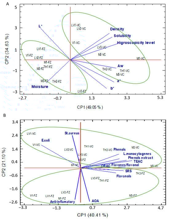 Two PCAs were carried out: one on the physico-chemical results and the other one on the bioactive properties. Regarding the PCA on the physico-chemical properties (Figure 5A), the first component explained 49.05% of the variance, while the second component explained 34.63%. PC1 was mainly defined by hygroscopicity and aw, while PC2 was mainly defined by L*. P were separated into two groups. The first one was composed by VC-P (on the right side of Figure 5A), and the second one (on the left side of Figure 5A) by FZ-P. VC-P was characterized by higher density, hygroscopicity aw and a*, as well as lower solubility and moisture than FZ-P. With regard to the PCA about bioactive properties (Figure 5B), the first component explained 40.41% of the variance and the second component 21.10%. PC1 was defined by TPC, TFC, SRS, TEAC and ORAC, in contrast to PC2, which was defined by anti-inflammatory activity, AOA and antimicrobial activity against St. aureus. Again, the powders were separated into two groups. The first one (in Figure 5B, above) was composed of all VC-P and the second one (in Figure 5B, below) was composed of most FZ-P, the latter being characterized by higher AOA and anti-inflammatory activities, as well as by higher antimicrobial activity against St. aureus and E. coli. Although PCA separated the samples by the drying procedure–honey concentration factors, the botanical origin also showed an influence (Table 5). This influence was also described by Tomczyk et al. [46], who stated that the quality of honey powder was directly related to the botanical origin of the honey used for honey powder production.
