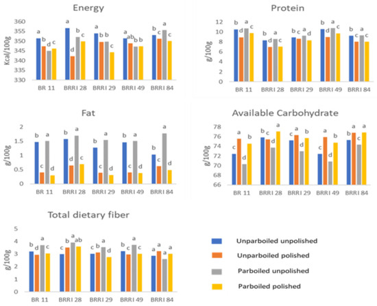 Akhter, K.T.; Shozib, H.B.; Islam, M.H.; Sarwar, S.; Islam, M.M.; Akanda, M.R.; Siddiquee, M.A.; Mohiduzzaman, M.; Rahim, A.T.M.A.; Shaheen, N. Variations in the Major Nutrient Composition of Dominant High-Yield Varieties (HYVs) in Parboiled and Polished Rice of Bangladesh. Foods 2023, 12, 3997. https://doi.org/10.3390/foods12213997