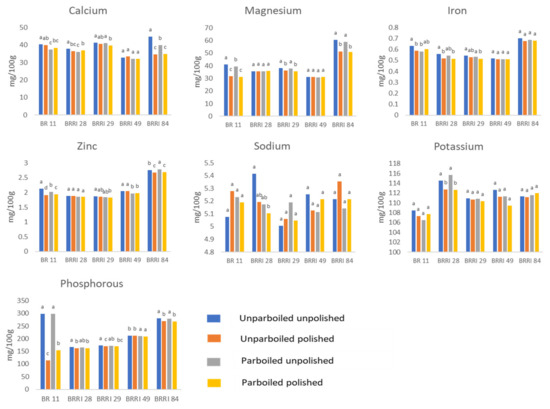 3.3. Parboiling and Polishing Effect on the Mineral Contents of Different Rice Varieties