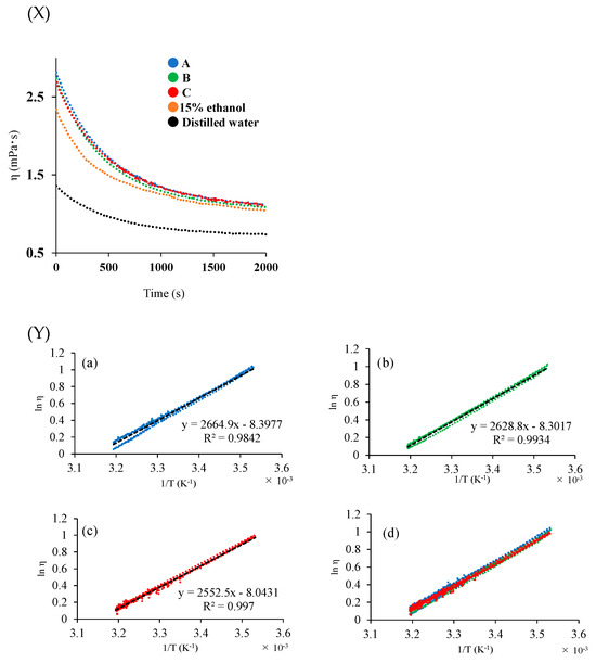 Samples A, B, and C (10 mL each) were weighed in a measuring cup to prepare the sample solution. The temperature was gradually increased from 10 °C to 40 °C, and the change in viscosity was measured. The measurements were performed using an SV-10/SV100 (A&D, Tokyo, Japan) (n = 3). The viscosities of a 15% ethanol solution and distilled water were measured as references. The measured viscosity curve was used to calculate the activation energy using the Andrade equation (Equation (3)).